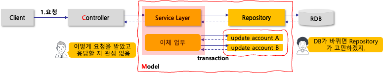MVC 디자인 패턴에서 Model은 크게 Service Layer와 Data Access Layer(Repository)로 구성된다. 이제까지는 Spring Data JPA를 이용해서 Data Access Layer를 어떻게 구성하는지 살펴봤고 이번 포스트에서는 Service Layer에 대해 살펴보자.