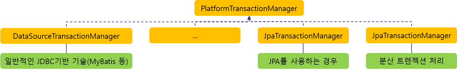 DataSourceTransactionManager: MyBatis나 Spring JDBC등 일반적인 JDBC 기반의 데이터 접근 기술에서 주로 적용