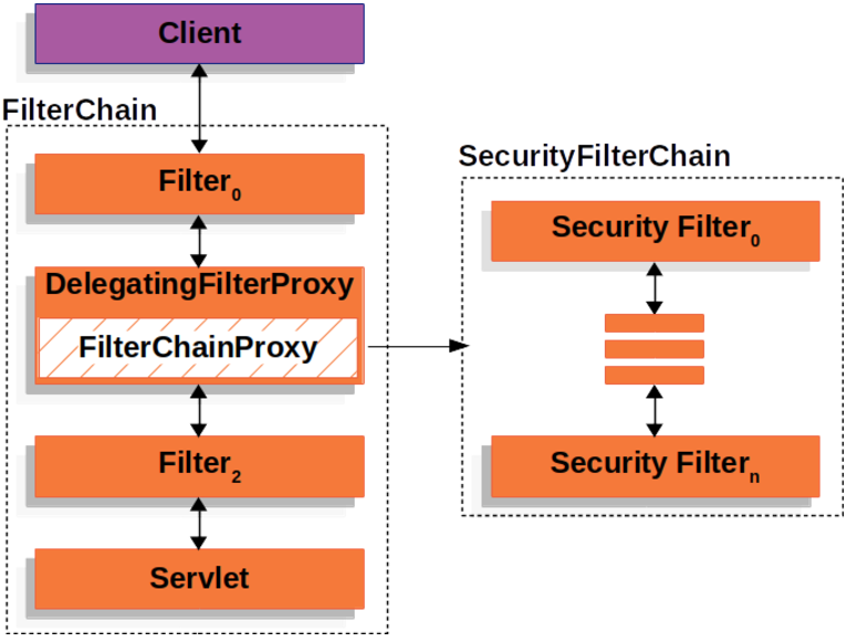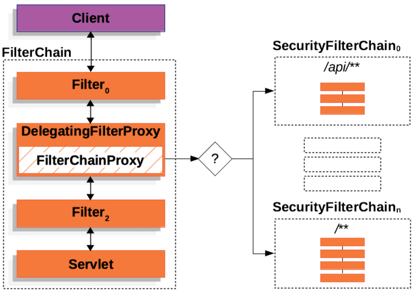 FilterChainProxy는 모든 보안 필터들을 관리하고 조율하는 역할을 수행한다. 우리가 만드는 SecurityFilter들은 직접 Servlet Container에 등록되지 않고 FilterChainProxy가 사용하는 SecurityFilterChain에 의해 FilterChainProxy를 통해서 관리한다.