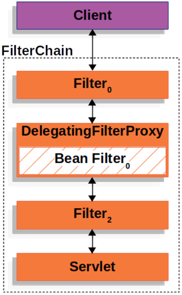 이 Filter는 Spring과 무관한 기술이다. 따라서 Spring Framework의 다양한 빈들을 사용하는게 기본적으로 말이 안된다. 이에 Spring에서는 DelegatingFilterProxy라는 이름의 filter를 제공한다.