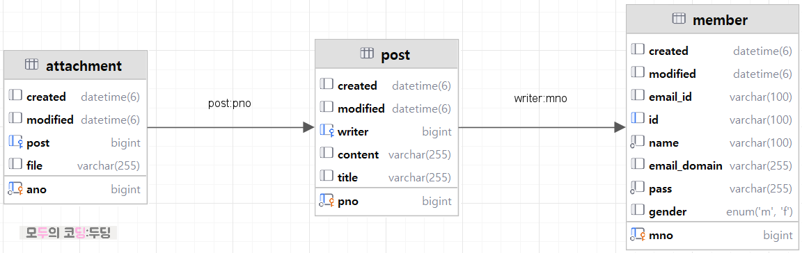 - 특정 pno에 해당하는 Post를 조회한다. -> 이때 fetch 속성이 EAGER인 Member와 Attachment까지 조회한다.