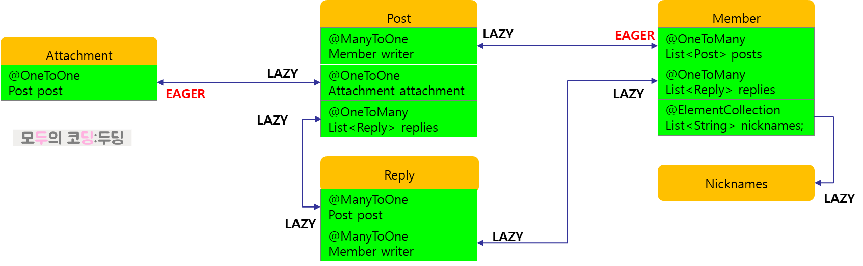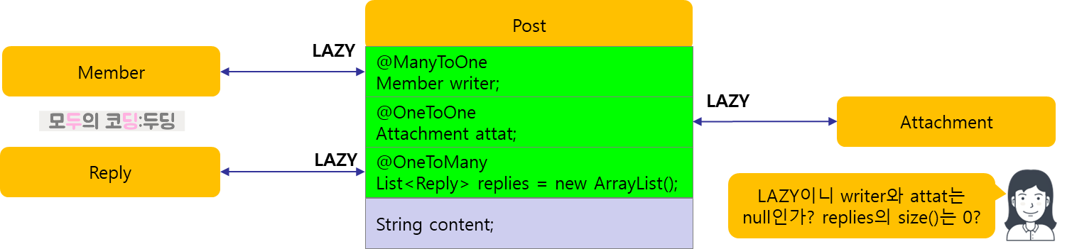 현재 Post, Reply, Attachment, Member간에 설정된 관계에 의한 기본 fetch 타입은 다음과 같다.