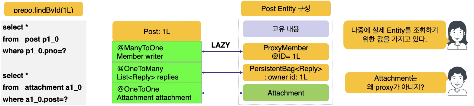 Attachment가 Proxy가 아닌 이유는 Proxy를 구성할 수 없기 때문이다. Proxy는 나중에 진짜 엔티티를 조회하기 위해 @ID에 해당하는 값을 가져야 한다. Post와 Member 사이에서 관계의 주인은 Post이므로, Post에는 Member의 @ID에 해당하는 값이 있어서 이를 이용해 Proxy를 구성할 수 있다. 그러나 Post와 Attachment 사이에서 관계의 주인은 Attachment이다. 이 경우, Post를 조회해서는 Attachment의 @ID에 해당하는 값을 알 수 없기 때문에 Proxy를 생성할 수 없다. 결과적으로 처음부터 엔티티를 구성하게 된다.