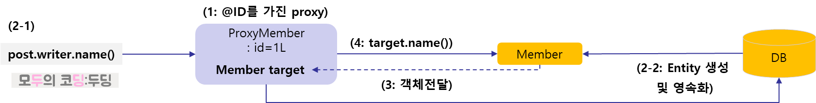 - 대상 Entity가 비영속 상태인 경우는 Proxy를 구성해서 Entity를 대체한다. 이 Proxy는 대상 엔티티의 @ID를 갖는다. 관계의 소유자인 Post 테이블만 조회해도 writer의 id는 가져올 수 있으므로 이 값을 이용해서 Proxy를 구성한다.