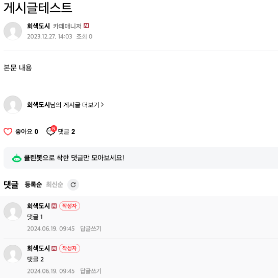 - 게시글 조회: 게시글을 조회하는 경우 대부분 하단에 댓글들도 같이 조회된다. Post에서 Reply는 LAZY하기 때문에 그냥 뒀다가는 select를 두번 해야 하는 상황이 발생한다. 이때는 Post에서 Reply에 대한 관계 설정에서 LAZY 대신 EAGER로 설정하는 것이 좋을 수도 있다. 다만 링크를 통해 댓글을 조회하는 방식이라면 LAZY로 그냥 두는 것이 좋을 수도 하다.