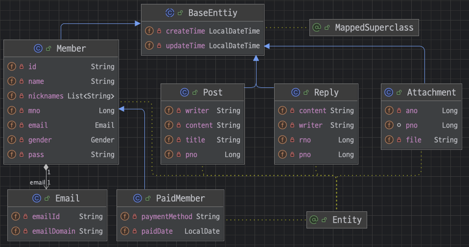 이제까지의 내용을 고려하여 게시판을 만들기 위해 필요한 엔티티들을 구성해보자. Post, Reply, Attachment는 모두 com.doding.board.post.model.entity 패키지에 작성한다.