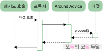 - @Around advice 내에서 target 메서드를 호출하기 위해서 이제까지와 달리 JoinPoint를 상속받은 ProceedingJoinPoint를 파라미터로 갖는다.