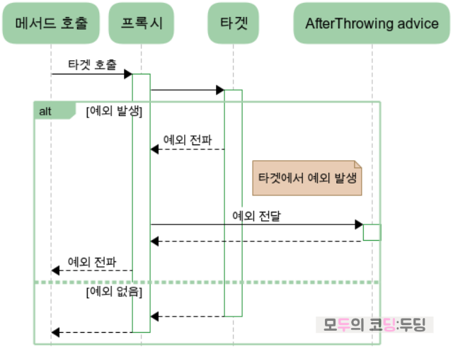- target에서 전파한 예외는 proceed()가 받아서 throws 한다. 따라서 try~catch로 처리하거나 다시 throws 해줘야 하는데 호출자에게까지 예외를 전달해주기 위해서는 당연히 throws 해줘야 한다.