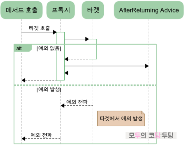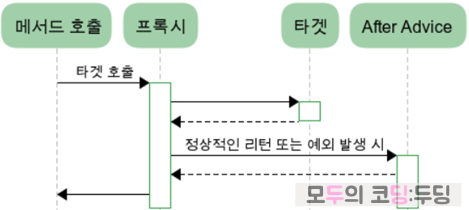| @AfterReturning | 타겟 메서드가 정상 종료(return) 후 advice 실행 |