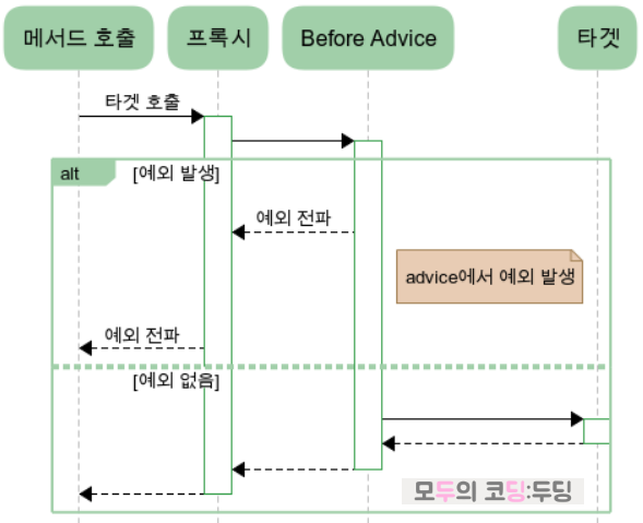 @Before가 선언된 advice는 target 메서드가 실행되기 전에 호출되며 advice에서 예외가 발생하면 아예 target이 호출되지 못한다.