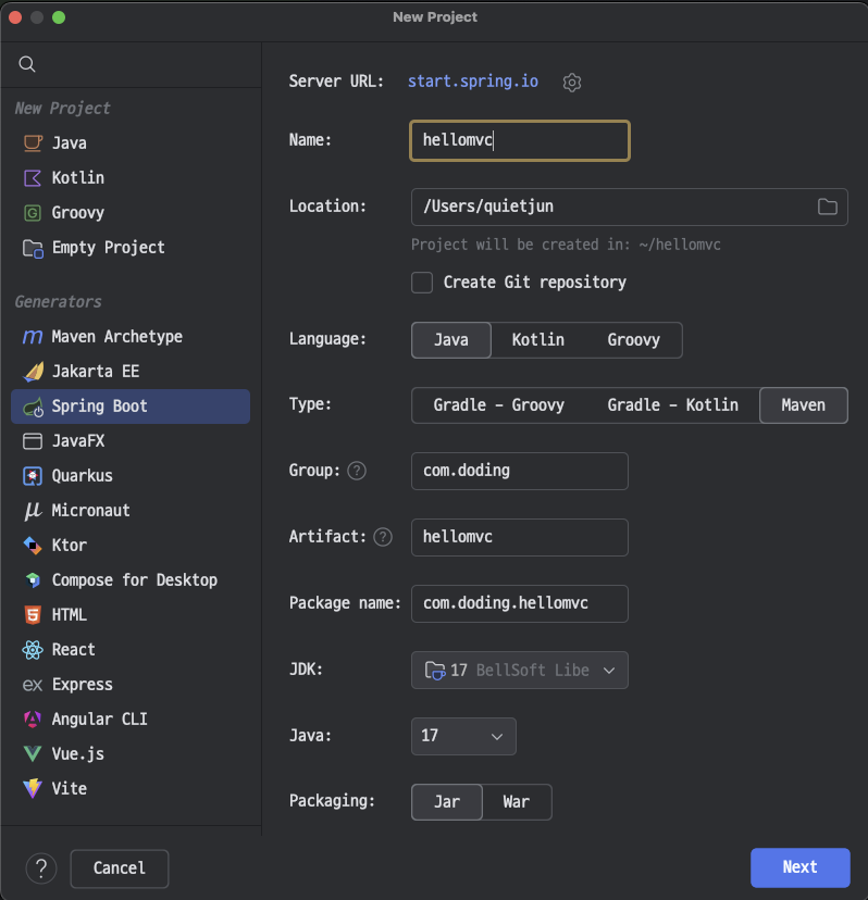 프로젝트 생성 첫 화면에서는 특별한 내용이 없다. 단 하나 집고 넘어갈 것은 Packaging 타입이 Jar라는 점이다. "웹 애플리케이션을 만들면 일반적으로 웹 서버에 배포해서 실행해게 되고 그럴 경우 War를 쓸텐데 왜 Jar일까?" 라는 정도의 궁금증을 남기고 [Next]로 넘어가자.
