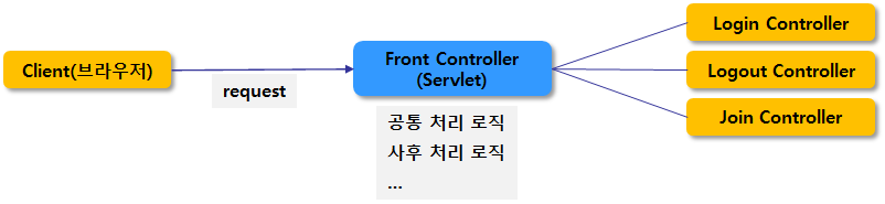 Spring MVC는 스프링을 통해서 웹 MVC 애플리케이션을 개발하기 위한 아키텍쳐로 [Front Controller 패턴]을 사용한다. Front Controller 패턴은 모든 클라이언트의 요청을 단일 진입점인 Front Controller가 처리하는 패턴으로 요청 처리 전/후 공통 모듈을 처리하기 용이하다.