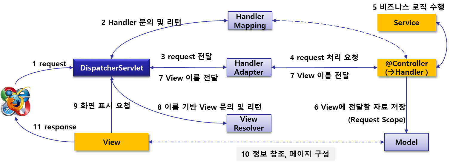 - Handler는 요청을 분석 후 필요한 서비스(모델영역)를 호출해서 비지니스 로직을 처리한다.