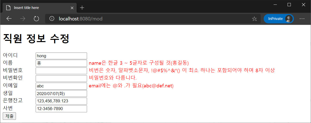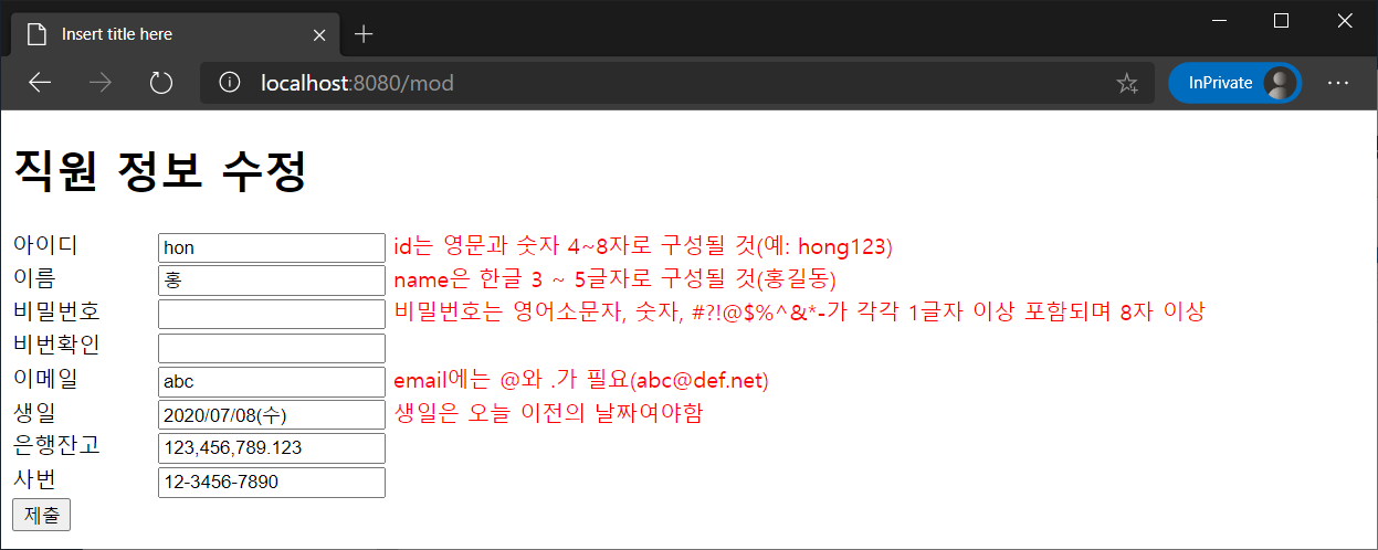 다음은 오류를 발생시켜서 내용을 검증해보자. password와 cPassword가 다른점과 email 형식이 다른 오류에 대해 잘 검증됨을 알 수 있다.