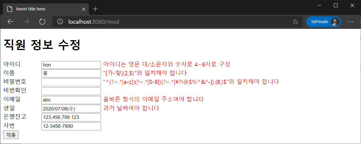 Pattern.emp.id={0}는 영문과 숫자 4~8자로 구성될 것(예: hong123)