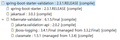 spring-boot-starter-validation에는 hibernate-validator와 jakarta.validation-api가 포함되어있네 이 두 개의 maven dependency에 validation을 검증할 수 있는 다양한 애너테이션들이 포함되어 있다.
