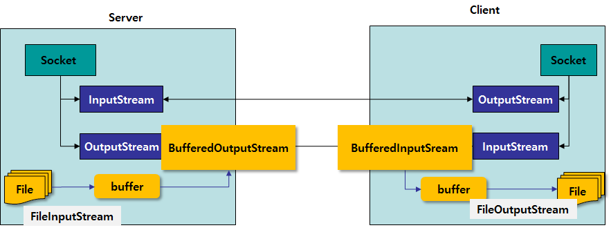 서버의 파일을 FileInputStream으로 읽어와서 소켓에 기반한 BufferedOutputStream으로 클라이언트로 출력하고 클라이언트는 역시 소켓에 기반한 BufferedInputStream으로 읽은 후 FileOutputStream으로 로컬 파일에 출력한다.