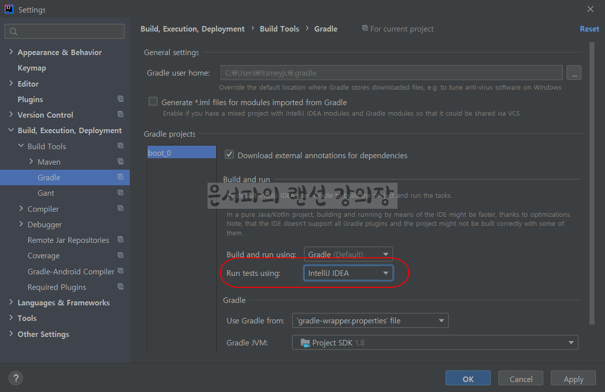 언제부턴가 intellij의 실행 옵션이 gradle task로 변경되어 단위테스트 실행 시 [no tests found for given includes xxxx] 오류가 발생한 다면 아래 화면에서 Run Tests using 항목을 IntelliJ IDEA로 변경해준다.
