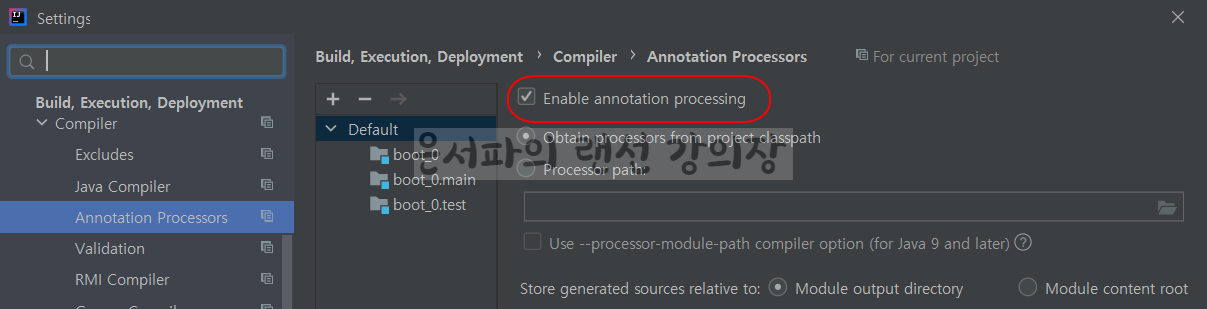 java에서 DTO를 생성할 때 많이 사용하는 lombok 플러그인을 설치한 후 제대로 동작하려면 settings > Build > Enable annotation processing 을 설정한다.