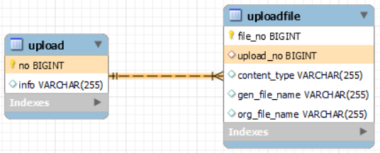 한번의 요청에 여러 개의 파일을 등록할 수 있는 구조로 작성할 계획이므로 upload에는 main 정보, uploadfile에는 detail 정보를 저장하자.