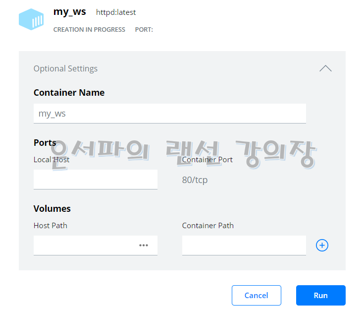 하지만 바로 [Run]을 실행하면 컨테이너의 이름이 자동 생성되서 관리가 어렵기 때문에 이름을 지정하는 것이 좋다. [Optional Settings]를 클릭하면 아래처럼 여러가지 설정 내용이 나오는데 [Container Name]항목에 my_ws와 같은 이름을 주고 [Run]을 클릭해보자.