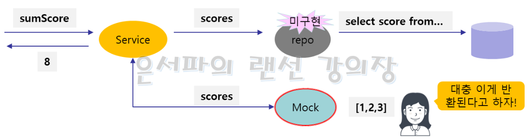 repo가 정상적으로 동작하려면 DB에 select 쿼리를 던져야 한다. 하지만 여기서 테스트 하려는 상황은 "repo가 정확한 값을 주는가?"가 아니라 "어떤 값을 받을 수 있고 repo에서 반환한 어떤 값을 반납할 수 있는가?"이다. repo가 1,2,3과 같은 dummy 데이터를 반환하건 실제 값을 반환하건 service를 테스트하는 데는 상관이 없는 것이다. 결국 굳이 DB를 연동할 필요는 없이 대충 지정된 값을 반환해주는 녀석이 있으면 된다. 이런 역할을 하는 것이 Mock이다.