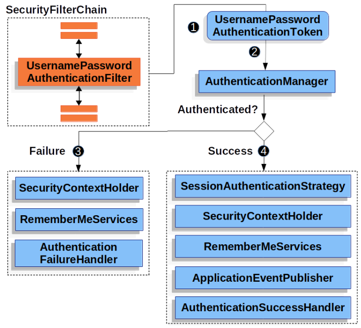 - 사용자가 username과 password를 제출하면 UsernamePasswordAuthenticationFilter는 username/password를 추출하여 UsernamePasswordAuthenticationToken을 생성한다.