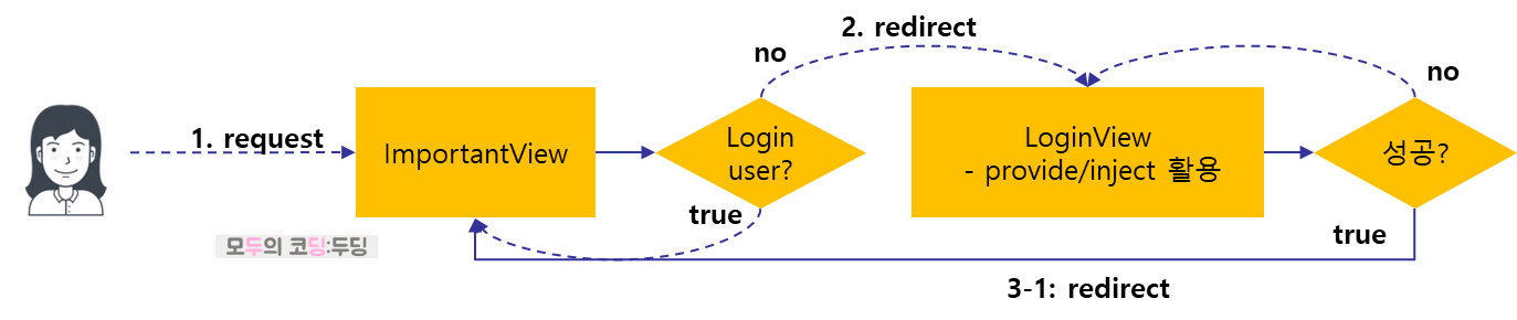 만약 이미 login 한 상태라면 ImportantView를 서비스하고 만약 그렇지 않다면 LoginView를 이용해서 login을 시도한다. 여기서 login에 성공하면 애초에 원했던 ImportantView로 이동하고 그렇지 않은 경우 login을 재시도한다.