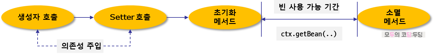 - 아직 빈을 활용하기 이전에 초기화 메서드를 실행한다. 초기화 메서드에서는 빈에서 사용하려는 자원을 초기화 할 수 있다.