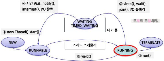 - 동작하던 스레드는 sleep(), wait(), join(), I/O 블로킹 등의 상태에 따라 WAITING 또는 TIMED_WAITING 상태가 될 수 있다. 이 스레드들은 대기 풀(waiting pool)에서 관리된다.