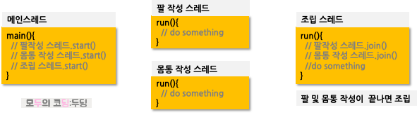 join()은 다른 스레드(원인스레드)의 작업이 종료될 때까지 대기 풀에서 대기하게 만든다. 다음의 경우 팔과 몸통의 작성이 끝난 후에 조립 스레드가 동작해야 한다. 이를 위해 조립 스레드는 팔작성.join(), 몸통작성.join()을 호출하고 각 스레드의 종료를 대기 풀에서 기다린다.