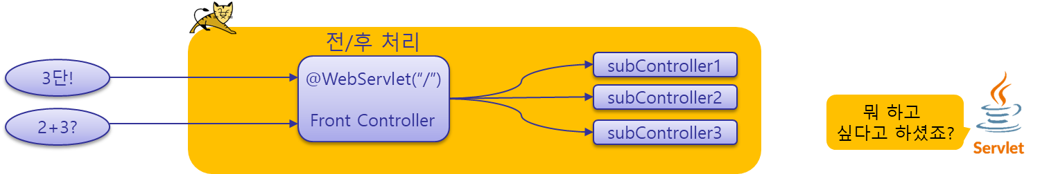 이렇게 단순히 셔틀 역할을 하는 Servlet을 여러 개 만들 필요는 없다. 차라리 모든 요청을 받아들이는 Servlet 하나만 남겨두고, 필요한 Mode/View를 연결하도록 하면 훨씬 간단해진다. 이런 Servlet을 front controller 라고 하고 이런 작업 방식을 front controller pattern이라고 한다.