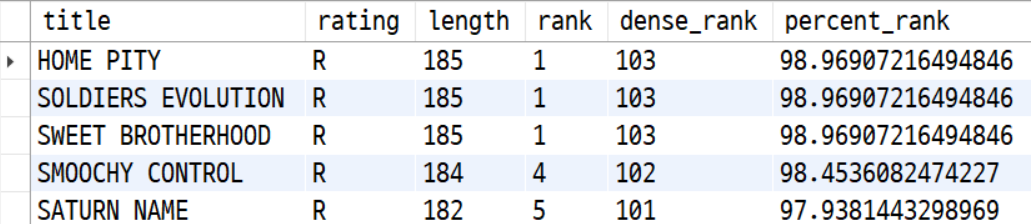 RANK()의 경우는 피어들에 동일한 순위 값을 할당하고 그 다음으로 큰 값은 개수 기반으로 등수를 정한다.(1,1,1,4,...) DENSE_RANK() 역시 피어에 동일한 순위 값을 할당하지만 다음으로 큰 값은 단지 +1이다.(1, 1, 2) PRECENT_RANK()는 백분율로 등수를 나타낸다.