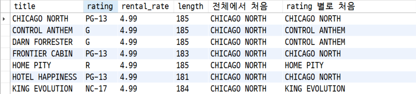 first_value(title) over(partition by rating) "rating 별로 처음"