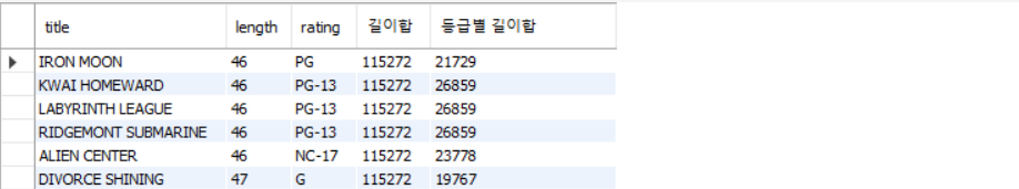 두 번째의 경우는 partition by rating에 의해 window 함수는 파티션(rating) 별 sum을 구한다. 값으로는 마치 집계함수로 썼을 때의 group by와 유사하다고 보면 된다. 하지만 결과는 partition 별로 각 row에서 사용된다.