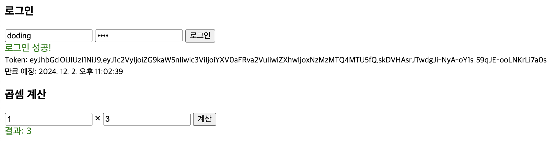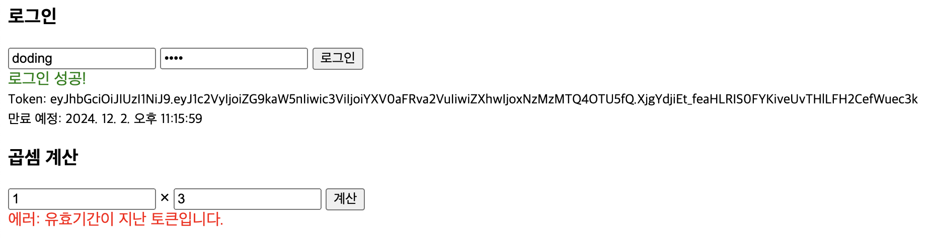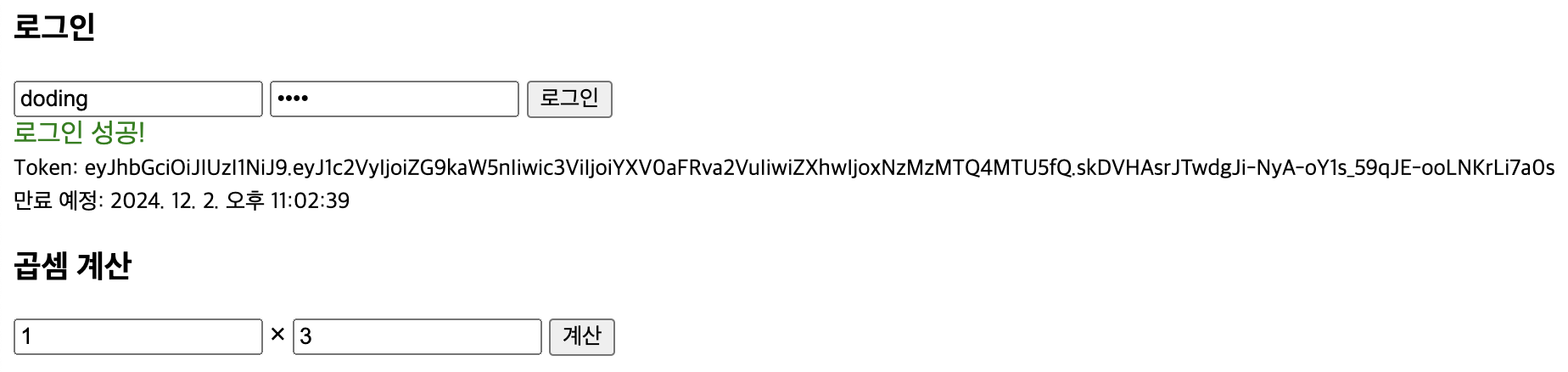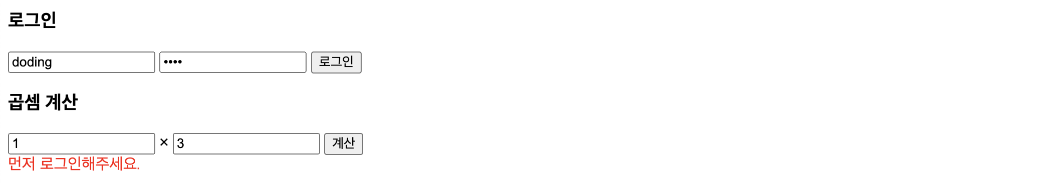 만약 토큰이 없는 상태에서 곱셈을 요청하면 로그인 이 필요하다는 메시지가 출력된다.