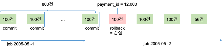 예외 상황이므로 Transaction은 rollback 될꺼고 801번째부터 900번까지의 데이터는 손실된다. 다시 데이터를 읽으면 901번부터 처리 되므로 결국 중간의 100건은 손실된다.