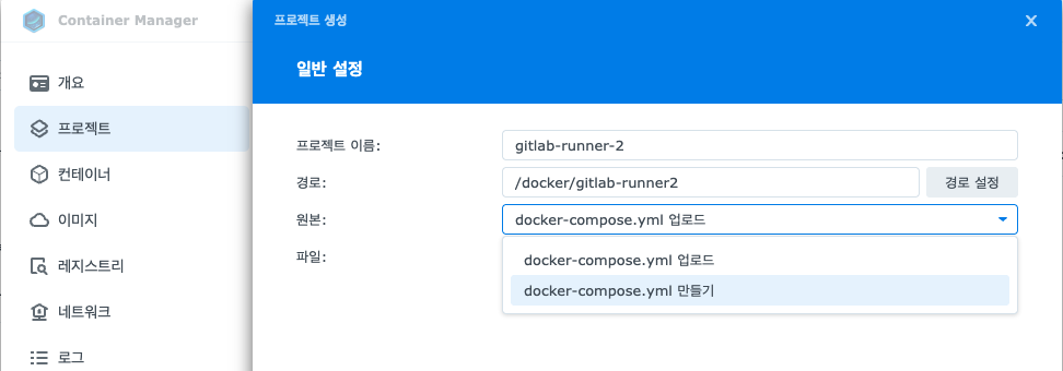 Synology의 Container Manager > Project > 생성을 선택한다.