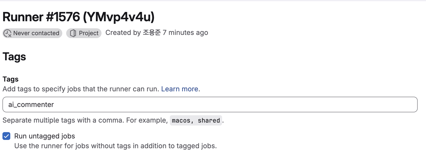 다음 화면에서 Tags에 이름을 입력해주고 [Run untagged jobs]에 체크하자. 안그러면 태그가 안맞는 경우 처리가 pending 된다.